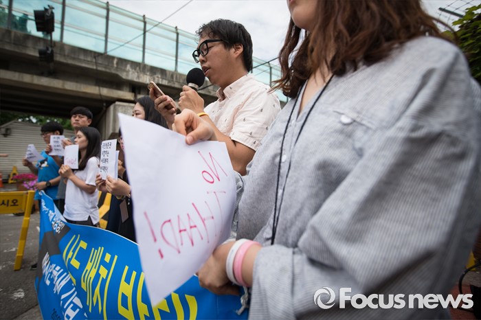 (서울=포커스뉴스) 좋은 대한민국 만들기 대학생 운동본부' 소속 학생들이 15일 오전 서울 용산 미군 기지 앞에서 '사드 배치 반대 48시간 대학생 긴급농성 선포' 기자회견을 열고 있다. 이날 대학생들은 기자회견을 마친 후 용산 미군 기지 2번 게이트 앞에서 48시간 농성에 들어갔다.