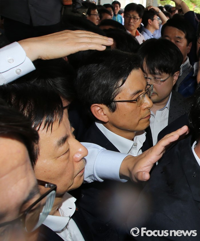(성주=포커스뉴스) 황교안 국무총리와 한민구 국방부장관이 15일 오전 경북 성주군청광장에서 사드(THAAD, 고고도미사일방어체계) 배치에 대한 주민설명회를 가진 가운데 성난 주민이 물병을 투척하자 경호원들이 막고 있다.
