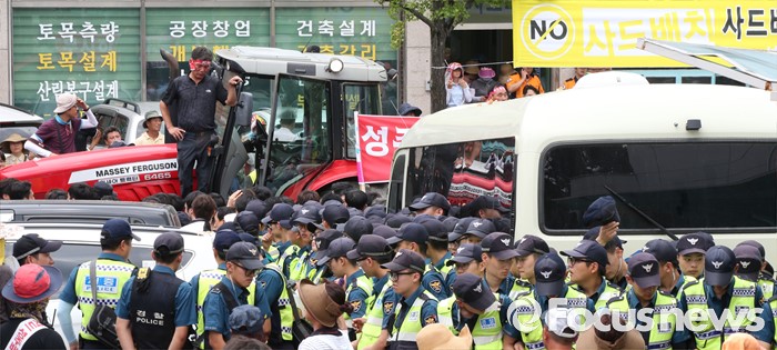 | △ 사드 반대 성난 주민 총리앞 트렉터로 막고 항의 |