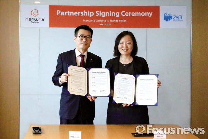 (서울=포커스뉴스) 한화갤러리아는 갤러리아면세점63 전면 개장 당일인 15일 오후 서울 여의도 63빌딩에서 중국 완다그룹 페이판과 마케팅 제휴 협약을 체결했다.