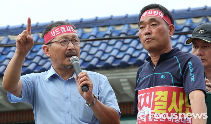 (성주=포커스뉴스) 황교안 국무총리와 한민구 국방부장관이 15일 경북 성주군청광장에서 사드(THAAD, 고고도미사일방어체계) 배치에 대한 주민설명회를 마치고 차량으로 이동하면서 주민들이 차량을 막아서 5시간째 대치 상태를 보였다. 주민 대표가 황교안 총리와 면담을 갖고 결과를 주민들에게 알리고 있다.