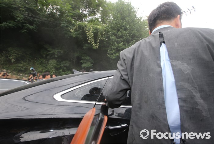 (성주=포커스뉴스) 황교안 국무총리와 한민구 국방부장관이 15일 경북 성주군청광장에서 사드(THAAD, 고고도미사일방어체계) 배치에 대한 주민설명회를 마치고 차량에 갖혀 6시간 넘게 대치중 버스에서 내려 승용차로 빠져나가려 하자 주민과 마찰이 발생, 경호원의 자켓이 찟어져 있다.