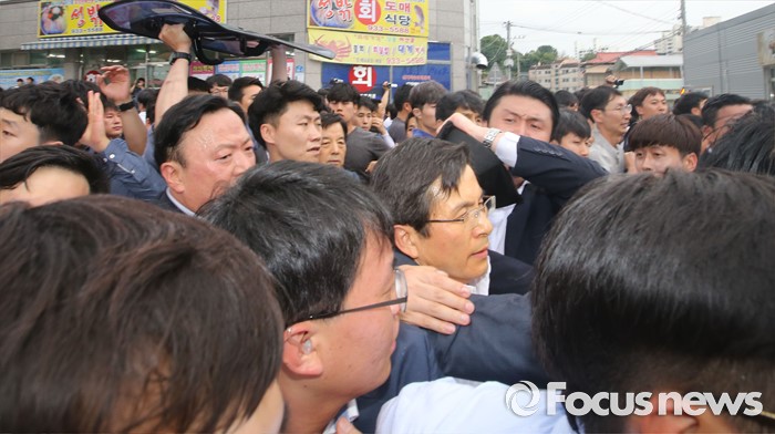 (성주=포커스뉴스) 황교안 국무총리와 한민구 국방부장관이 15일 경북 성주군청광장에서 사드(THAAD, 고고도미사일방어체계) 배치에 대한 주민설명회를 마치고 차량에 갖혀 6시간 넘게 대치중 버스에서 내려 승용차로 갈아탔지만 승요차도 막히자 황 총리가 차량에서 내려 빠져나가고 있다.