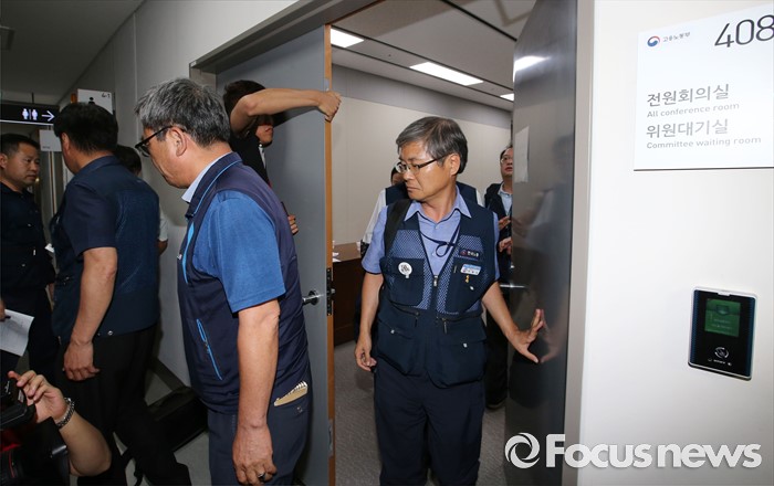(세종=포커스뉴스) 15일 저녁 세종시 정부세종청사 고용노동부에서 열린 최저임금위원회 제13차 전원회의에서 근로자 위원들이 일방적인 회의 진행에 동참할 수 없다며 회의장을 나서고 있다.
