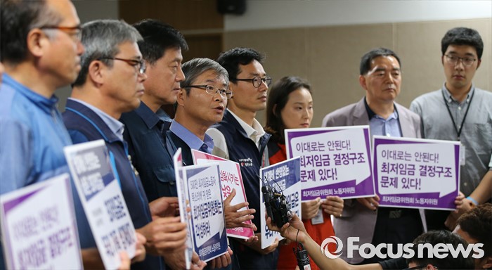 (세종=포커스뉴스) 15일 저녁 세종시 정부세종청사 고용노동부에서 열린 최저임금위원회 제13차 전원회의에서 근로자 위원들이 단체로 회의장을 나와 일방적인 회의 진행에 동참할 수 없다는 기자회견을 하고 있다.