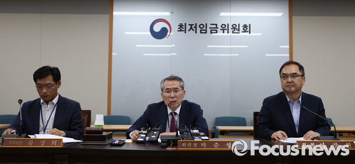 (세종=포커스뉴스) 박준성 최저임금위원회 위원장이 16일 새벽 세종시 정부세종청사 고용노동부 전원회의실에서 열린 제14차 전원회의를 마치고 2017년도 적용 최저임금안을 6470원에 의결했다고 밝히고 있다.