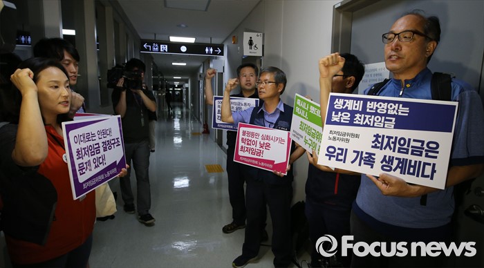 한편 최저임금위원회는 공익위원 9명, 근로자위원 9명, 사용자위원 9명으로 구성된 고용노동부 소속의 행정위원회로, 최저임금에 관한 심의 및 재심의·의결 등을 담당한다.15일 저녁 세종시 정부세종청사 고용노동부에서 열린 최저임금위원회 제13차 전원회의에서 근로자 위원들이 운영위원회와 논의하지 않은 일방적인 회의 진행으로 심의에 동참할 수 없다며 회의장을 나와 구호를 외치고 있다. 2016.07.16 김기태 기자