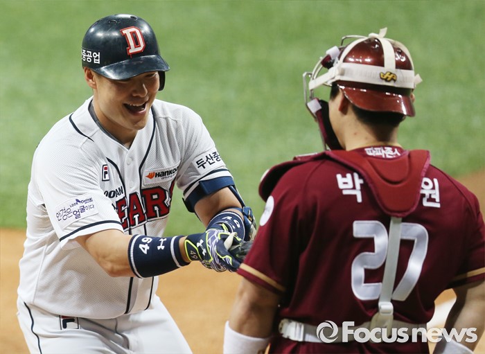 (서울=포커스뉴스) 16일 서울 고척 스카이돔에서 열린 2016 프로야구 올스타 경기에서 드림팀 민병헌이 1회말 좌월 솔로 홈런을 치고 홈이놔며 나눔팀 포수 박동원과 장난치고 있다