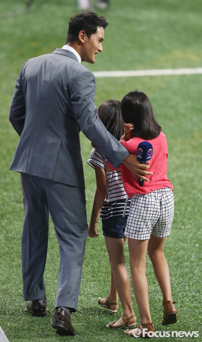 (서울=포커스뉴스) 16일 서울 고척 스카이돔에서 열린 2016 프로야구 올스타 경기에 앞서 KBO 국제홍보위원으로 위촉된 박찬호가 두딸과 함꼐 퇴장하고 있다.