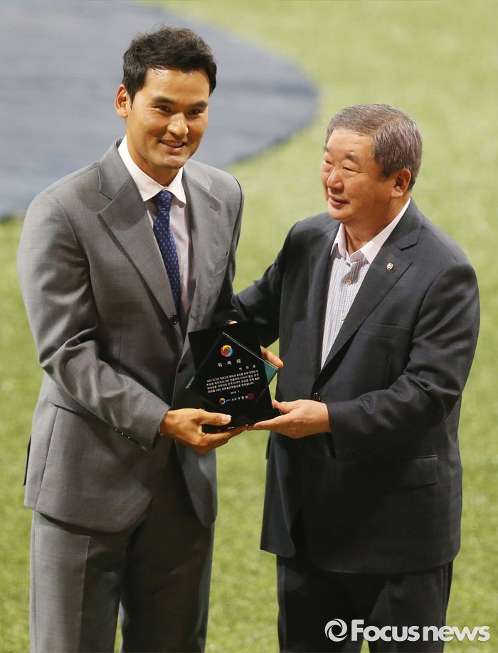 (서울=포커스뉴스) 16일 서울 고척 스카이돔에서 열린 2016 프로야구 올스타 경기에 앞서 KBO 국제홍보위원으로 위촉된 박찬호가 구본능 KBO 총재와 기념사진을 찍고 있다.