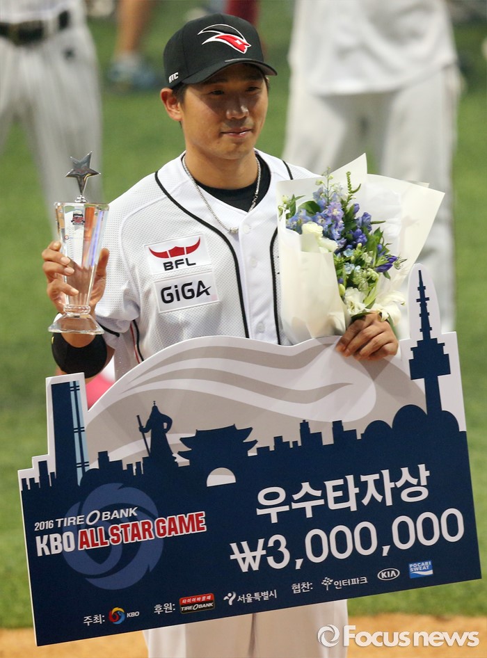 (서울=포커스뉴스) 16일 서울 고척 스카이돔에서 열린 2016 프로야구 올스타전에서 드림팀 박경수가 우수타자상을 받고 포즈를 취하고 있다.