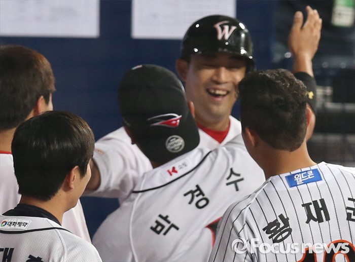 (서울=포커스뉴스) 16일 서울 고척 스카이돔에서 열린 2016 프로야구 올스타 경기 7회말 1사후 드림팀 정의윤이 두 타자 연속 좌월 솔로 홈런을 치고 더그아웃에서 박경수의 축하를 받고 있다.