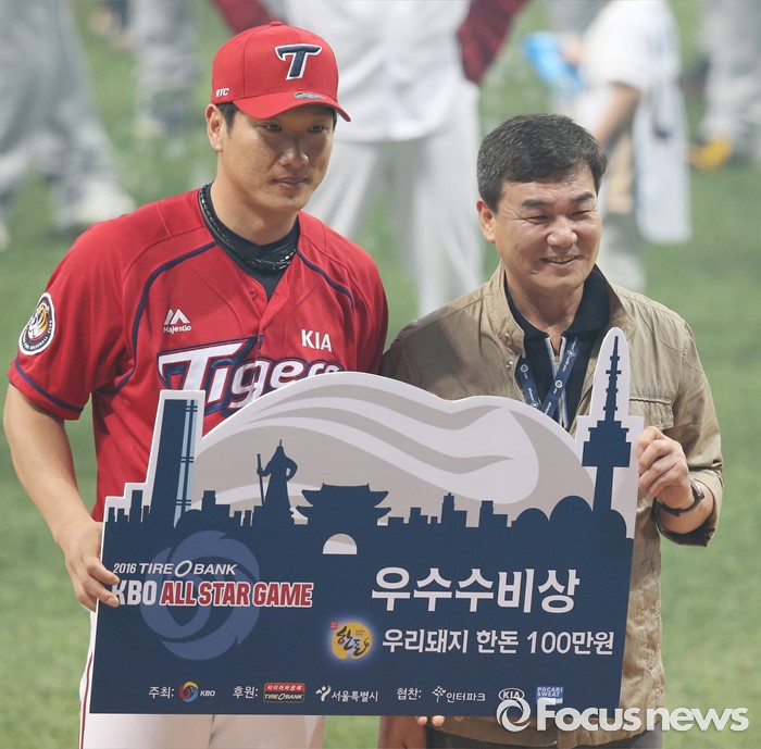 (서울=포커스뉴스) 16일 서울 고척 스카이돔에서 열린 2016 프로야구 올스타전에서 나눔팀 김주찬이 우수수비상을 받고 포즈를 취하고 있다.