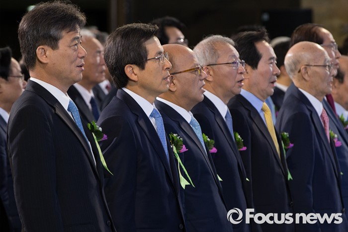 (서울=포커스뉴스) 황교안(왼쪽 두 번째) 국무총리를 비롯한 주요인사들이 17일 오전 서울 영등포구 여의도 국회의사당 중앙홀에서 열린 제68주년 제헌절 경축식에 참석해 국민의례를 하고 있다. 왼쪽부터 이인복 중앙선거관리위원장, 황 총리, 박한철 헌법재판소장, 양승태 대법원장, 정세균 국회의장.