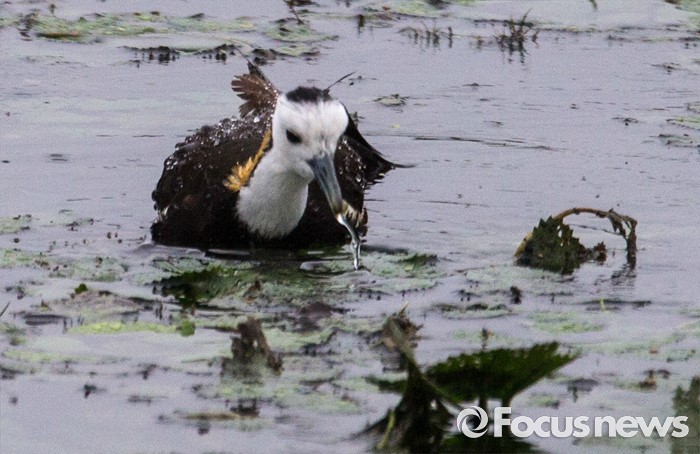 (의왕=포커스뉴스) 물꿩이 경기도 의왕시 왕송지 연밭에서 작은 수서곤충을 잡아먹고 있다.
