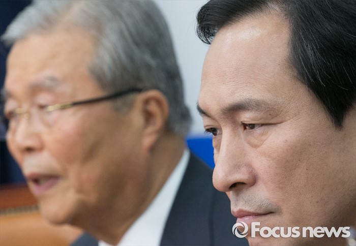 (서울=포커스뉴스) 18일 오전 서울 여의도 국회에서 열린 더불어민주당 비상대책위원회의에 참석한 우상호(오른쪽) 원내대표가 김종인 비대위 대표의 발언을 듣고 있다.