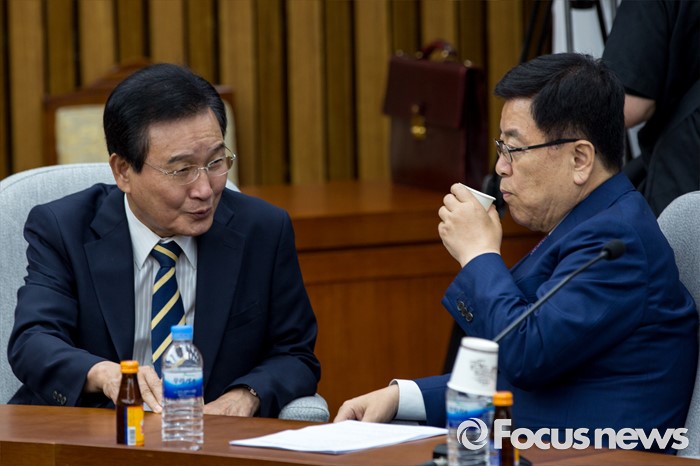 (서울=포커스뉴스) 김광림(오른쪽) 새누리당 정책위의장과 변재일 더불어민주당 정책위의장이 18일 오전 서울 여의도 국회에서 열린 '3당 정책위의장-경제부총리, 3차 민생경제 현안점검회의'에 참석해 대화 하고 있다.