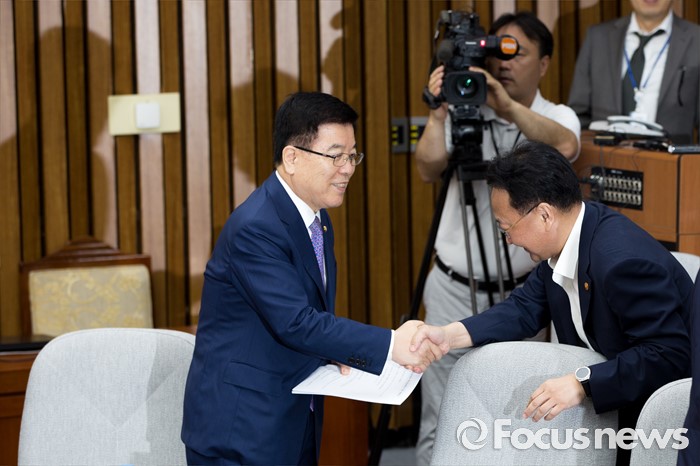 (서울=포커스뉴스) 김광림(왼쪽) 새누리당 정책위의장과 유일호 경제부총리 겸 기획재정부 장관이 18일 오전 서울 여의도 국회에서 열린 '3당 정책위의장-경제부총리, 3차 민생경제 현안점검회의'에 참석해 악수 하고 있다.