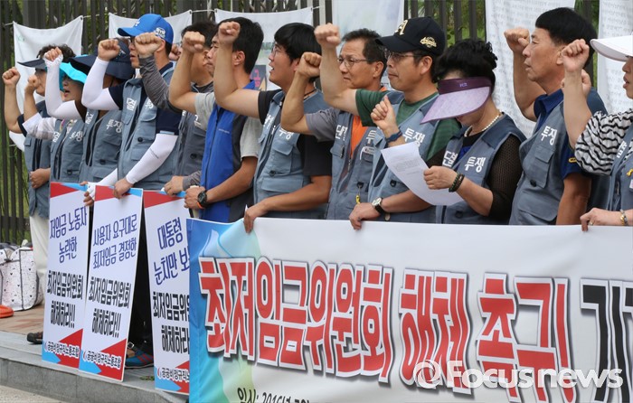 (세종=포커스뉴스) 공공비정규직노동조합 구성원들이 18일 오전 세종시 정부세종청사 고용노동부 앞에서 기자회견을 열고 2017년도 최저임금 6470원 결정 무효를 주장하며 최저임금위원회 해체를 촉구하고 있다.