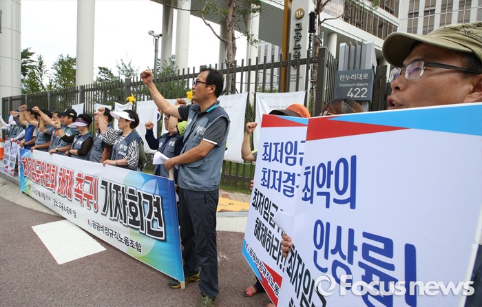 (세종=포커스뉴스) 공공비정규직노동조합 구성원들이 18일 오전 세종시 정부세종청사 고용노동부 앞에서 기자회견을 열고 2017년도 최저임금 6470원 결정 무효를 주장하며 최저임금위원회 해체를 촉구하고 있다.