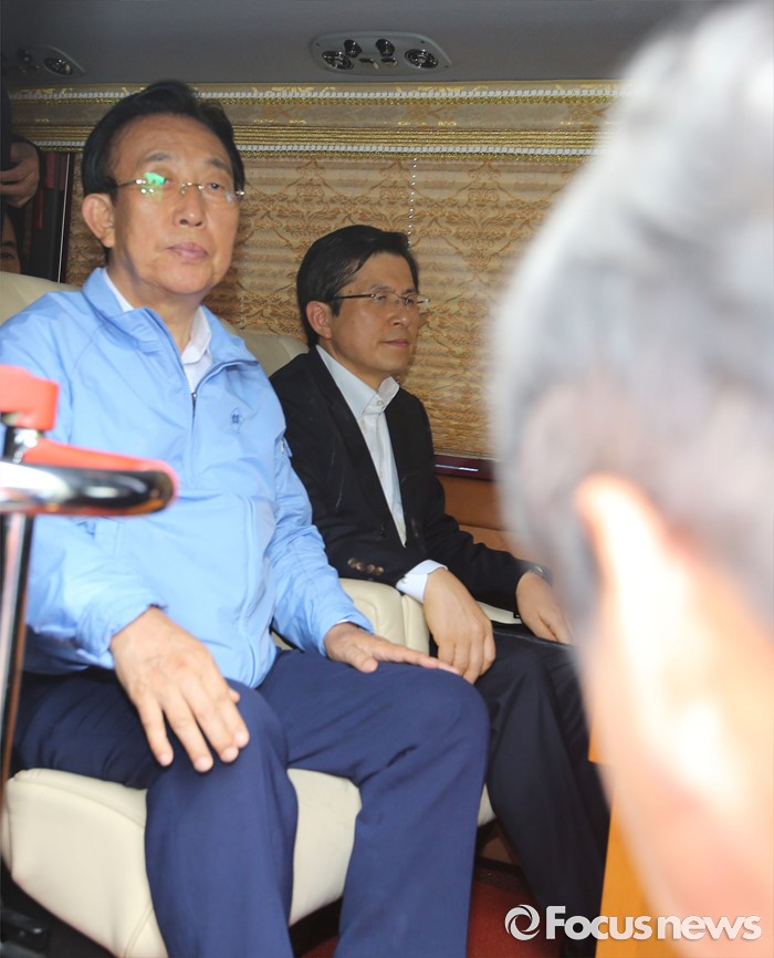 석 국장은 또한, 오는 21일 성주군민 2000명이 버스 50대에 나눠 타고 서울로 상경해 서울역 광장에서 대대적인 '사드 성주배치 반대 집회'를 열 예정이라고 밝혔다.지난 15일, 성주군을 방문한 황교안 국무총리(우)와 함께 발이 묶였던 김관용 경북도지사(좌). <사진촬영=김기태 기자 >