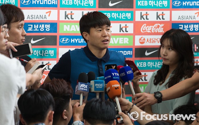 (인천공항=포커스뉴스) 2016년 리우데자네이루 올림픽 메달에 도전하는 올림픽 축구 국가대표팀 권창훈이 18일 오후 인천국제공항에서 브라질 상파울루로 출국하기 전 취재진 질문에 답하고 있다.