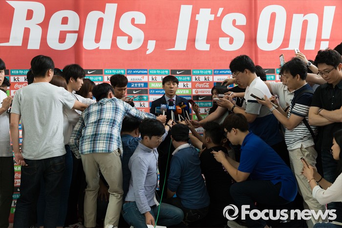 (인천공항=포커스뉴스) 2016년 리우데자네이루 올림픽 메달에 도전하는 신태용 올림픽 축구 국가대표팀 감독이 18일 오후 인천국제공항에서 브라질 상파울루로 출국하기 전 취재진 질문에 답하고 있다.