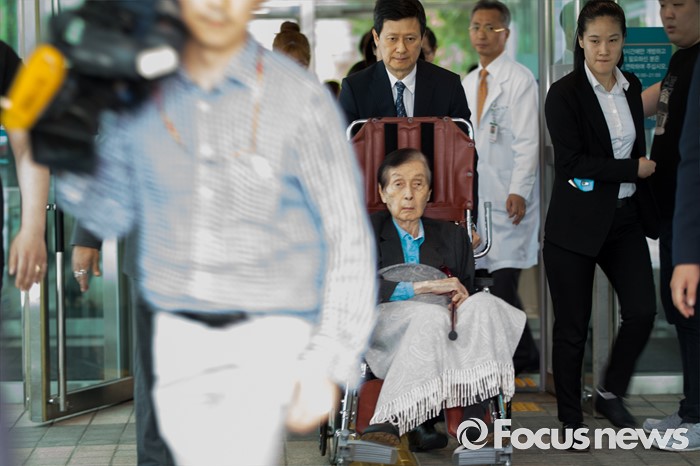 (서울=포커스뉴스) 신격호 롯데그룹 총괄회장이 입원 40일만인 18일 오후 서울 송파구 서울아산병원에서 퇴원, 신동주 전 일본 롯데홀딩스 부회장과 병원을 나서고 있다.