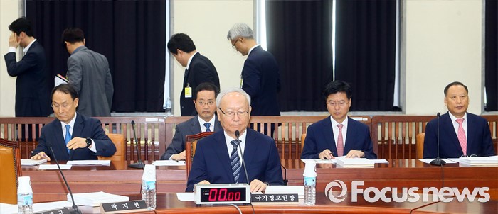 (서울=포커스뉴스) 이병호 국가정보원장을 비롯한 국정원 관계자들이 18일 오후 서울 여의도 국회에서 열린 정보위원회 전체회의에 참석 하고 있다. 이헌수(뒷줄 왼쪽부터) 국정원 기조실장, 김진섭 1차장, 최윤수 2차장, 최종일 3차장.