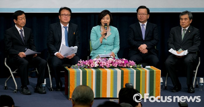 (서울=포커스뉴스) 18일 오후 서울 여의도 국회 헌정기념관에서 한국적 제3의 길 후원으로 열린 '개헌을 말하다 의원 대담, 어떤 헌법인가?'에 참석한 진영(왼쪽부터), 민병두, 박영선, 김부겸 더불어민주당 의원, 이상돈 국민의당 의원이 대담을 하고 있다.