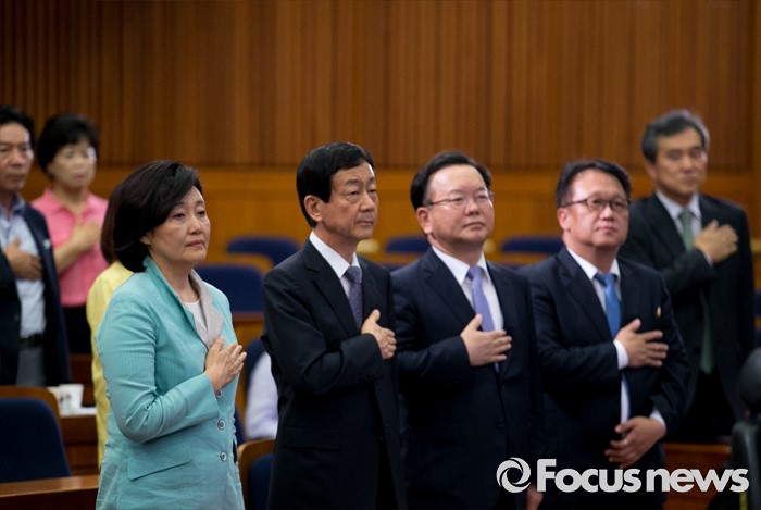 (서울=포커스뉴스) 18일 오후 서울 여의도 국회 헌정기념관에서 한국적 제3의 길 후원으로 열린 '개헌을 말하다 의원 대담, 어떤 헌법인가?'에 참석한 박영선(왼쪽부터), 진영, 김부겸, 민병두 더불어민주당 의원, 이상돈 국민의당 의원 등이 국기에 대한 경례를 하고 있다.