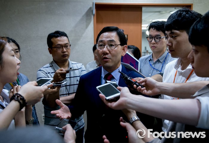 (서울=포커스뉴스) 전당대회 출마를 선언한 주호영 새누리당 의원이 18일 오후 서울 여의도 국회 정론관에서 추가로 공개된 윤상현 의원의 공천개입 녹취록과 관련 성명서를 발표한 뒤 취재진 질문에 답하고 있다.