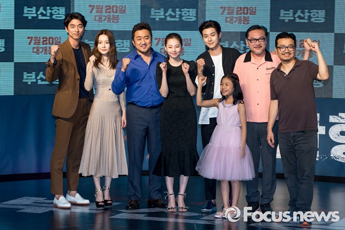 (서울=포커스뉴스) 18일 오후 서울 영등포구 타임스퀘어에서 열린 영화 '부산행' 레드카펫 행사에 참석한 출연 배우와 감독이 포토타임을 갖고 있다. 왼쪽부터 출연 배우 공유, 정유미, 마동석, 안소희, 최우식, 김수안, 김의성, 연상호 감독