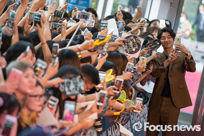 (서울=포커스뉴스) 18일 오후 서울 영등포구 타임스퀘어에서 열린 영화 '부산행' 레드카펫 행사에 참석한 배우 공유가 팬들과 함께 셀카를 찍고 있다.