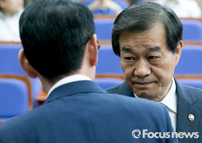 (서울=포커스뉴스) 19일 오전 서울 여의도 국회에서 열린 새누리당 의원총회에 참석한 황인무 국방부 차관이 김도읍 원내수석부대표와 대화하고 있다.