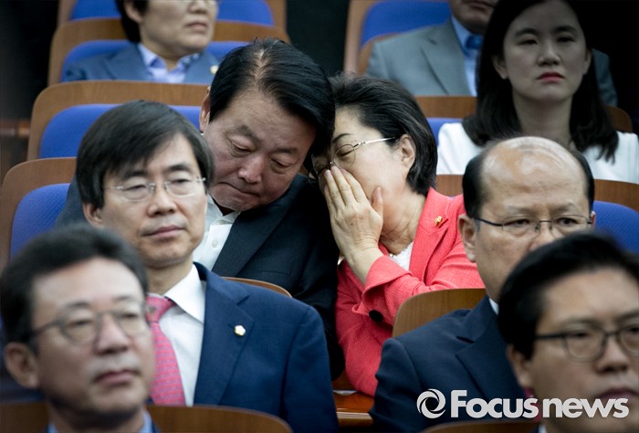 (서울=포커스뉴스) 19일 오전 서울 여의도 국회에서 열린 새누리당 의원총회에 참석한 한선교(왼쪽), 이은재 의원이 대화하고 있다.
