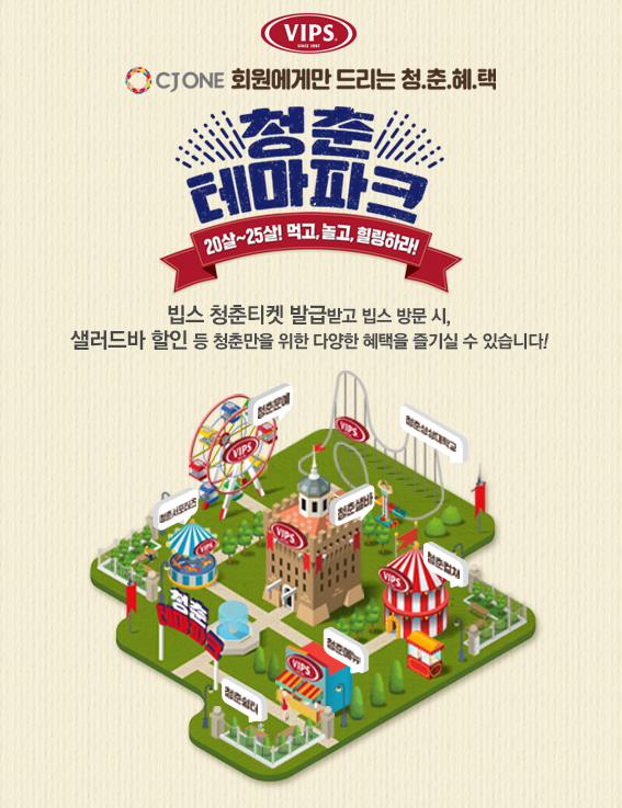 빕스는 이들을 위해 '청춘샐바' '청춘쉼터' 등 총 7개 프로그램을 선보일 계획이다. 캠페인 참여를 위해선 CJ ONE 홈페이지 이벤트 페이지에 접속해 '청춘티켓'을 다운로드한 뒤 신분증을 지참하고 매장에 방문하면 된다.