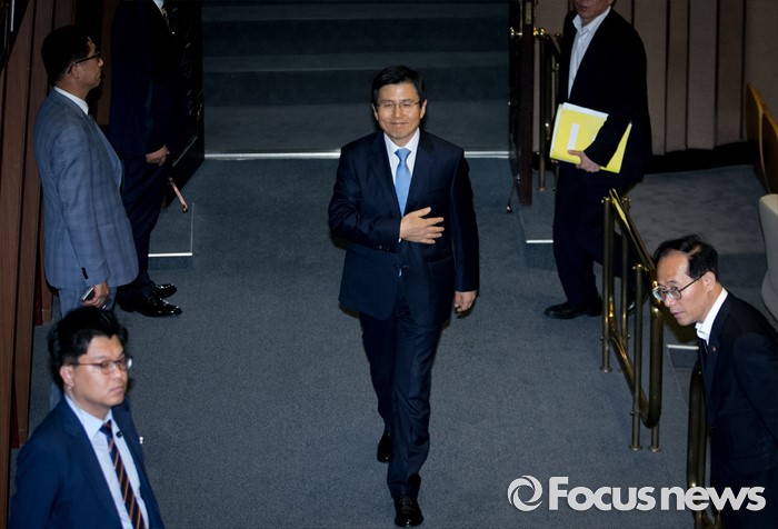 (서울=포커스뉴스) 19일 오전 서울 여의도 국회에서 344회 국회(임시회) 1차 본회의, 사드(THAAD·고고도미사일방어체계) 배치에 대한 긴급현안질문을 마친 뒤 황교안 국무총리가 퇴장하고 있다.