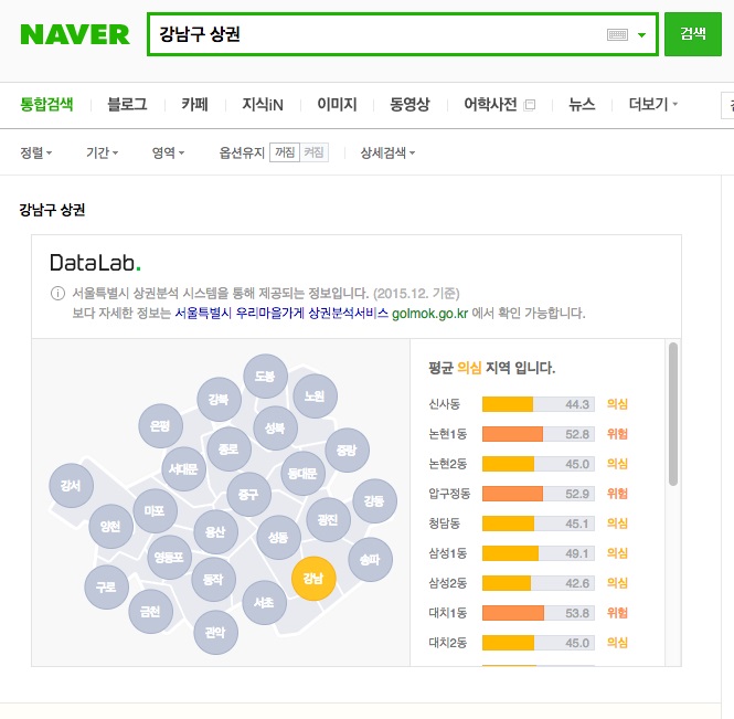 네이버는 서울시 내 25개 구 대상, 43개 업종을 분석한 지역별 창업위험지수 공공 데이터를 네이버 검색결과에서 별도의 데이터 랩(Data Lab.) 영역을 통해 제공한다. 예를 들어, 네이버 모바일 및 PC 검색창에 '서울시 상권', '은평구 상권', '강남구 상권', '용산구 상권' 등 지역별 상권을 입력하면 해당 지역의 창업위험지수를 그래프와 수치 형태로 간편하게 만나볼 수 있는 형태다.
