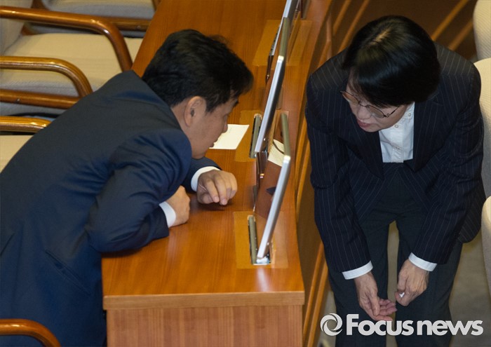 (서울=포커스뉴스) 19일 오후 서울 여의도 국회에서 열린 344회 국회(임시회) 1차 본회의, 사드(THAAD·고고도미사일방어체계) 배치에 대한 긴급현안질문에 참석한 김관영(왼쪽) 국민의당 원내수석부대표와 박선숙 의원이 대화하고 있다.