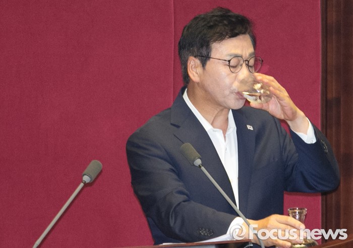 (서울=포커스뉴스) 19일 오후 서울 여의도 국회에서 열린 344회 국회(임시회) 1차 본회의, 사드(THAAD·고고도미사일방어체계) 배치에 대한 긴급현안질문에 참석한 이완영 새누리당 의원(경북 고령·성주·칠곡)이 발언에 앞서 물을 마시고 있다.