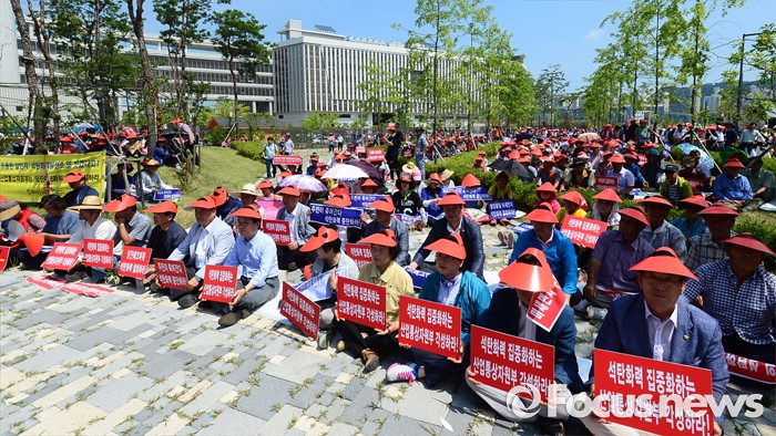 (세종=포커스뉴스) 충남 당진시민들이 19일 세종시 정부세종청사 산업통상자원부 앞에서 석탄화력발전소인 당진 에코파워 건설 철회를 촉구하고 있다.
