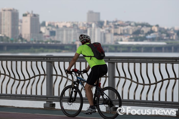 (서울=포커스뉴스) 서울 지역에 폭염주의보가 내린 19일 오후 서울 서초구 반포한강공원 일대에서 한 시민이 자전거를 타고 있다.