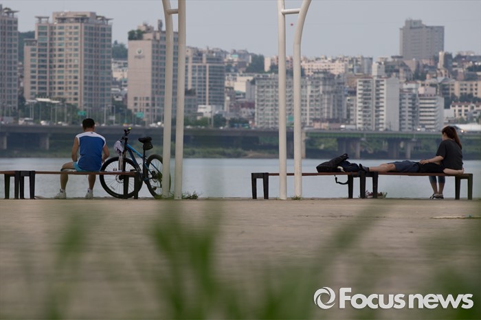 (서울=포커스뉴스) 서울 지역에 폭염주의보가 내린 19일 오후 서울 서초구 반포한강공원 일대에서 시민들이 휴식을 취하고 있다.
