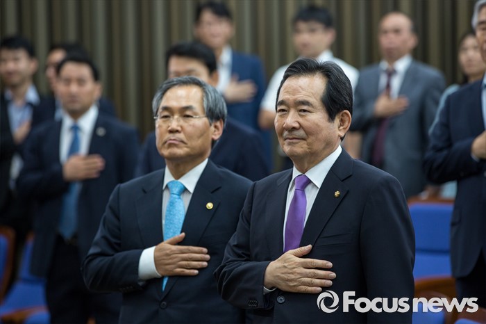 | △ 국민의례하는 정세균 국회의장-우윤근 사무총장 |