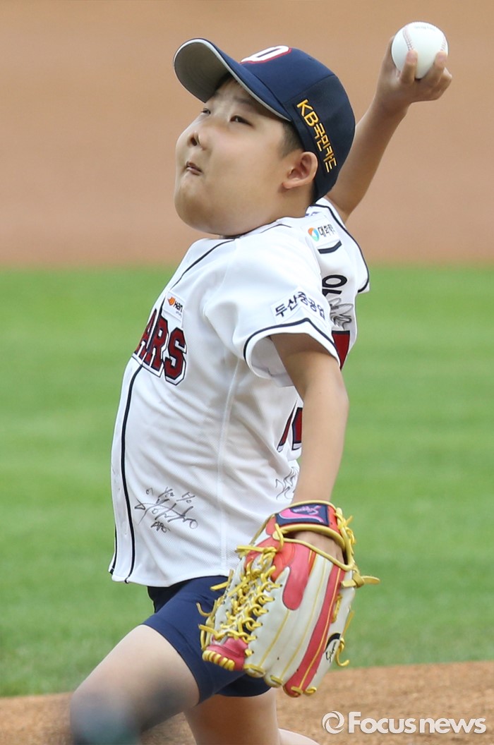 (서울=포커스뉴스) 19일 서울 잠실구장에서 열린 2016 프로야구 삼성-두산 경기에서 두산베어스의 '안면장애 청소년을 위한 소원성취 프로젝트'로 희귀 난치병인 세르비즘병을 앓고 있는 백우현(13세)군이 마운드에 올라 시구하고 있다.