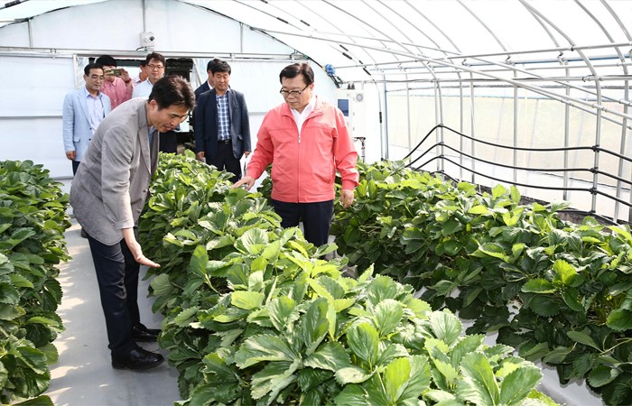 (세종=포커스뉴스) 이동필 농림축산식품부장관이 19일 세종시 조치원읍 세종 창조경제혁신센터를 찾아 출범 1주년 추진성과를 점검하고 연동형 온실교육장, 스마트팜 등을 현장 점검하고 있다. <사진제공=농림축산식품부>