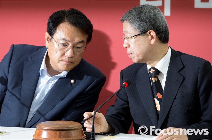 (서울=포커스뉴스) 20일 오전 서울 여의도 국회에서 열린 새누리당 혁신비상대책위원회의에 참석한 김희옥(오른쪽) 위원장과 정진석 원내대표가 대화하고 있다.