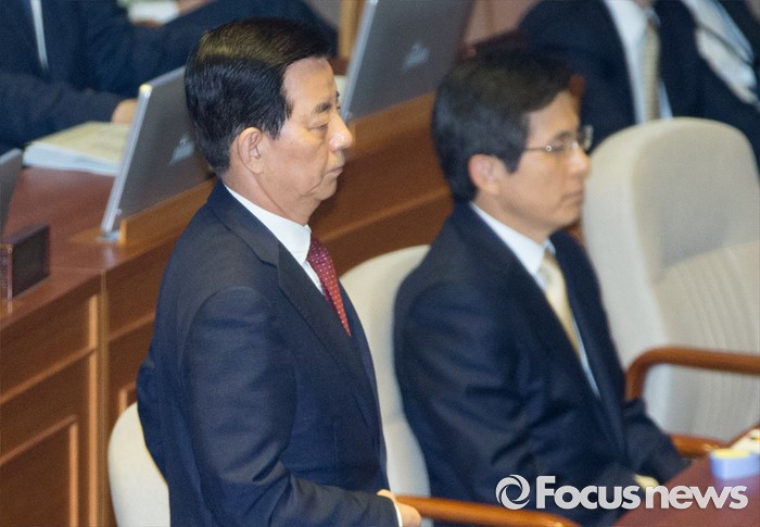 (서울=포커스뉴스) 20일 오전 서울 여의도 국회에서 열린 344회 국회(임시회) 2차 본회의, 사드(THAAD·고고도미사일방어체계) 배치에 대한 긴급현안질문에 참석한 한민구 국방부 장관이 의원들의 질문에 답하기 위해 이동하고 있다. 오른쪽은 황교안 국무총리.