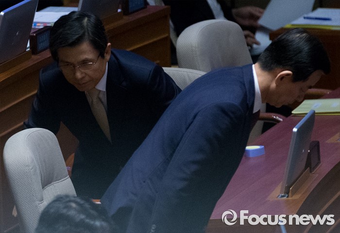 (서울=포커스뉴스) 20일 오전 서울 여의도 국회에서 열린 344회 국회(임시회) 2차 본회의, 사드(THAAD·고고도미사일방어체계) 배치에 대한 긴급현안질문에 참석한 황교안(왼쪽) 국무총리, 한민구 국방부 장관이 각각 자리로 향하고 있다.